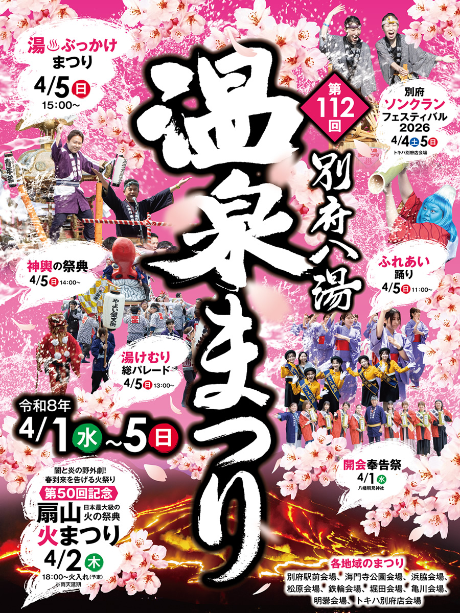 「別府八湯温泉まつり」は、温泉のめぐみに感謝するお祭りです。別府市では毎年4月1日を「温泉感謝の日」とし、その前後の期間に様々なイベントが開催されます。